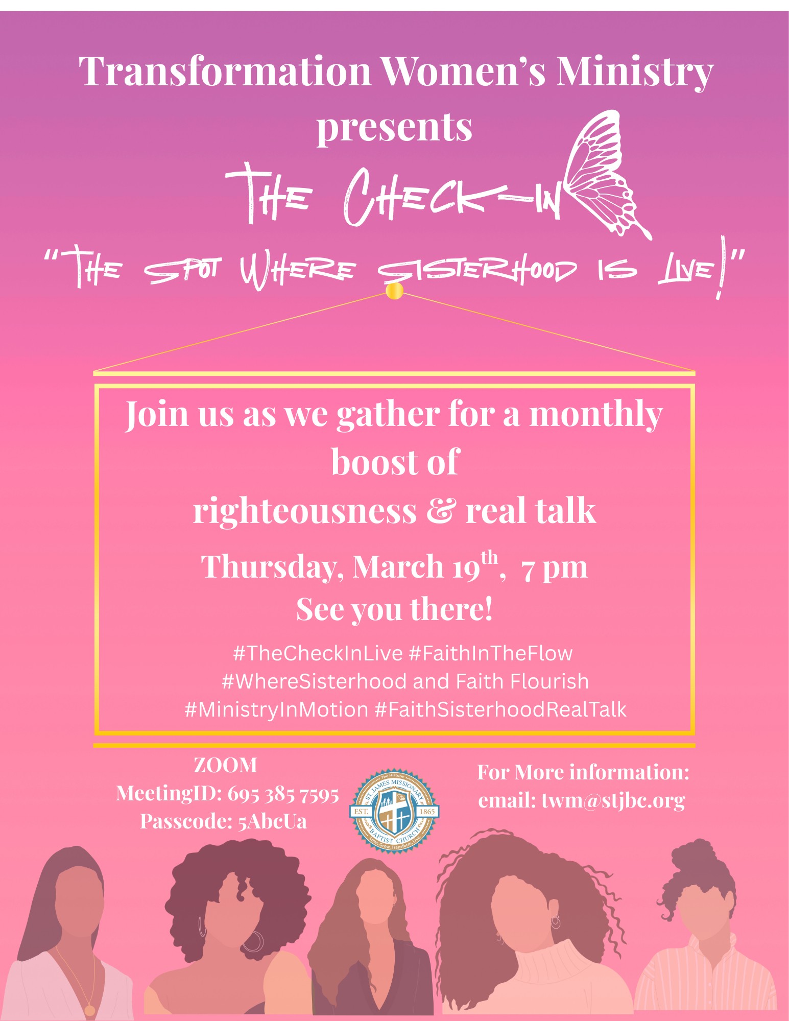 Transformation Women’s Ministry presents "The Check-In", the spot where sisterhood is live! Women of God, we invite you to join us for a monthly boost...